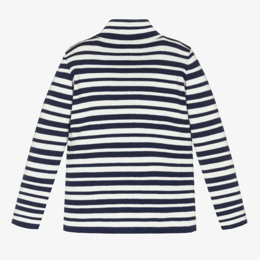 Younger boys and girls wool roll neck sweater by luxury brand, Gucci. Forming part of the Ouverture collection, this retro-inspired knit in white and navy blue stripes is soft and stretchy, with an intarsia weave of the design House's classic logo in red.
