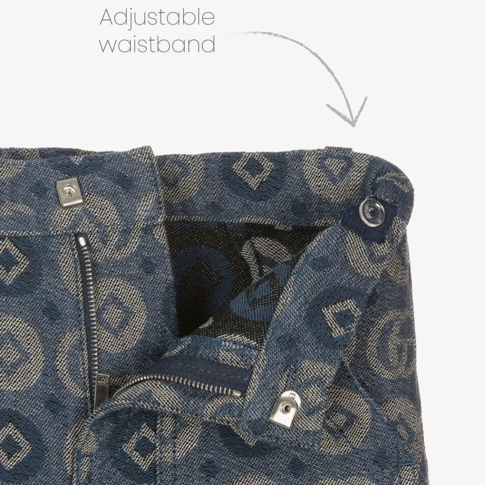 Stylish blue trousers for boys by luxury Italian brand Gucci, with the iconic Double G logo in a statement geometric pattern. Woven in soft cotton jacquard, they have an adjustable waistband for a comfortable fit, with side and back pockets. There is a zip and clip fastening, with a branded button for a finishing designer touch.