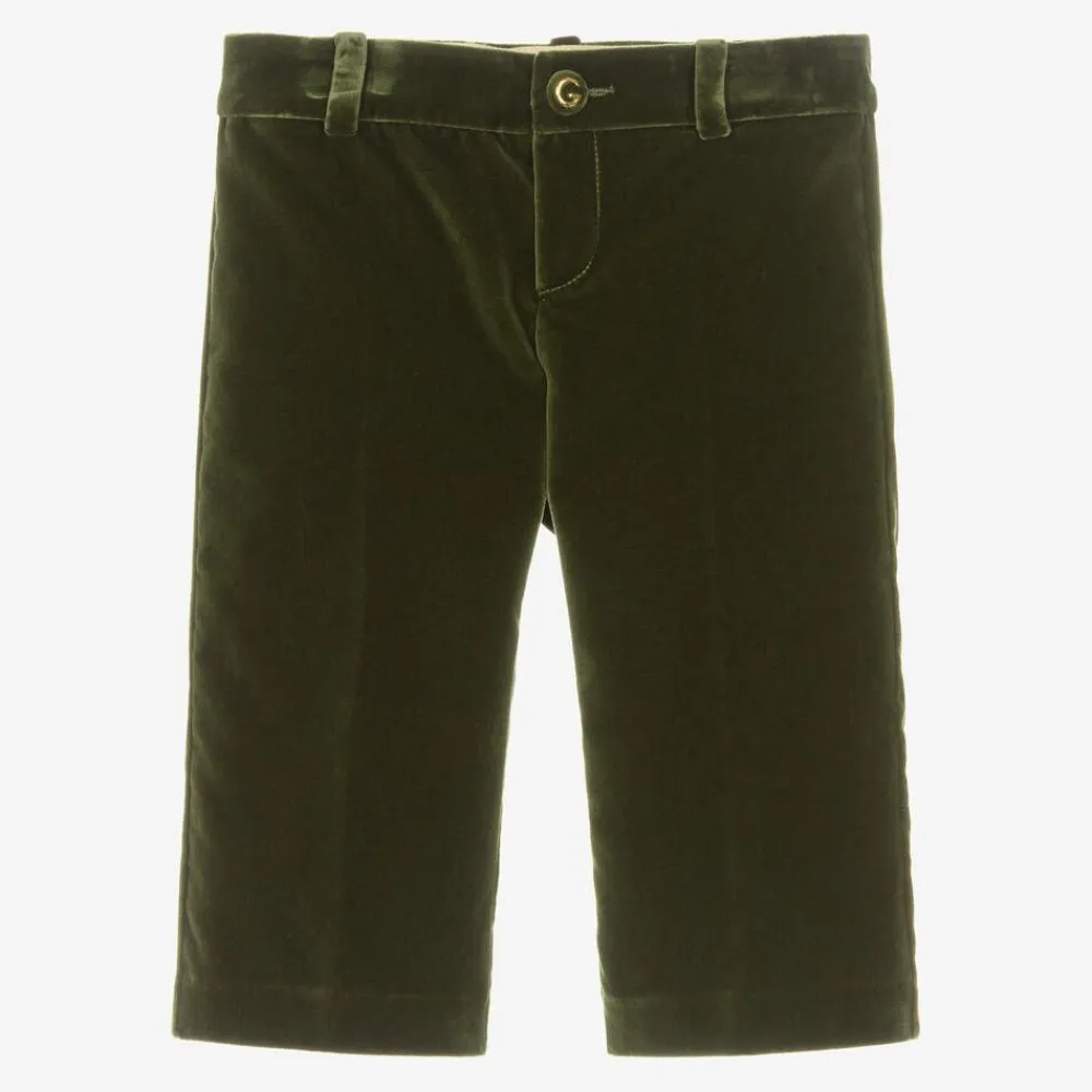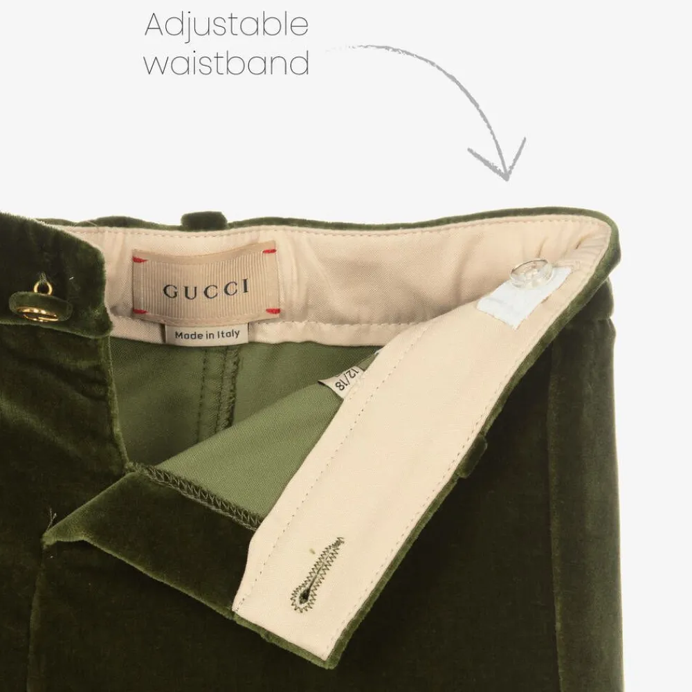 Smart and sophisticated green trousers for little boys by luxury Italian designer Gucci, crafted in luxuriously soft velvet. Featuring a shiny gold G button on the front for an added designer detail, they have a stylish straight leg and an adjustable waist for a great fit.