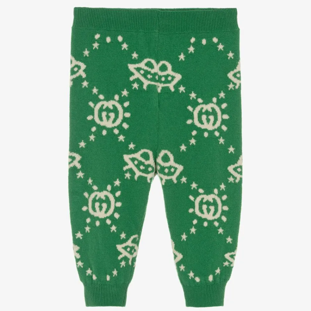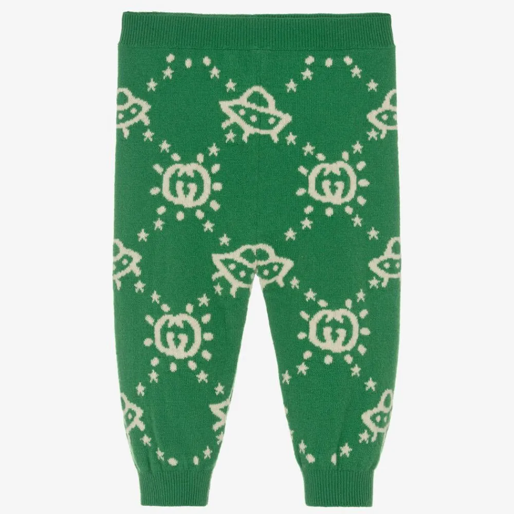 Green intarsia knit trousers for little boys by luxury designer Gucci, made in soft wool. A combination of signature style and comfort, these pull-on trousers have lightly ribbed trims and a stretchy waistband. Interlocking G logos and UFO motifs can be seen within the knit, bringing a touch of the Italian House's playful spirit.