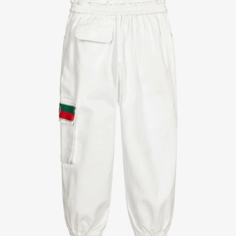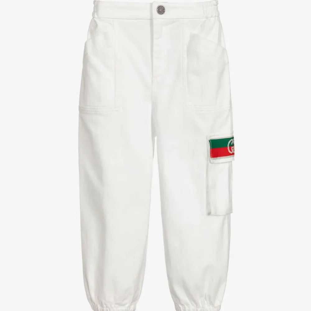 Boys white cotton denim trousers by luxury brand Gucci, with a red and green, Interlocking G Web patch on the side pocket. Soft and mid-weight, these wide-legged jeans have an elasticated waistband and cuffs. There are utility style side and back pockets, for a casual look.