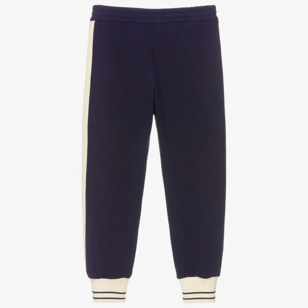 Casual navy blue joggers for boys and girls, by luxury Italian designer Gucci. Trimmed with sporty ivory stripes on the sides, they have a red and green striped detail on the sides, incorporating the iconic interlocking G logo embroidery. The stretchy waist makes these joggers comfortable, and the striped trims on the cuffs give them a retro feel.