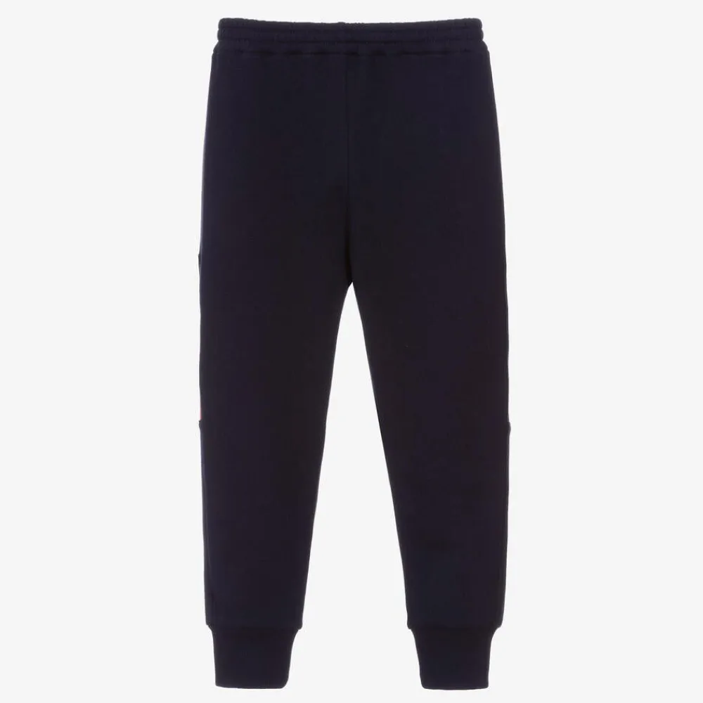 Navy blue joggers for boys by luxury Italian designer Gucci, made from mid-weight cotton jersey. They are comfortable and easy to wear with an elasticated waist and cuffed ankles. There is an eye-catching ivory and red logo on the back of one leg, including an Interlocking G logo appliqué.