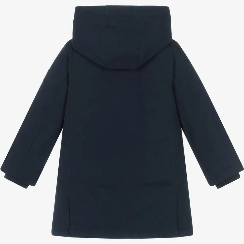 A classic navy blue parka coat for boys by Guess, with a beige faux fur trim and silky lining. Down-padded for extra warmth, this mid-weight coat has a hood that detaches with a zip for an alternative look. It fastens with a zip and poppers on the front, has useful flap pockets, and an iconic rubberised Triangle logo on one sleeve.