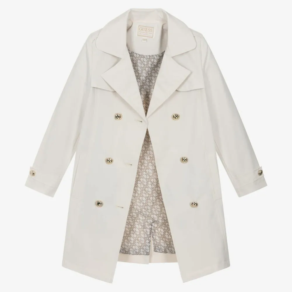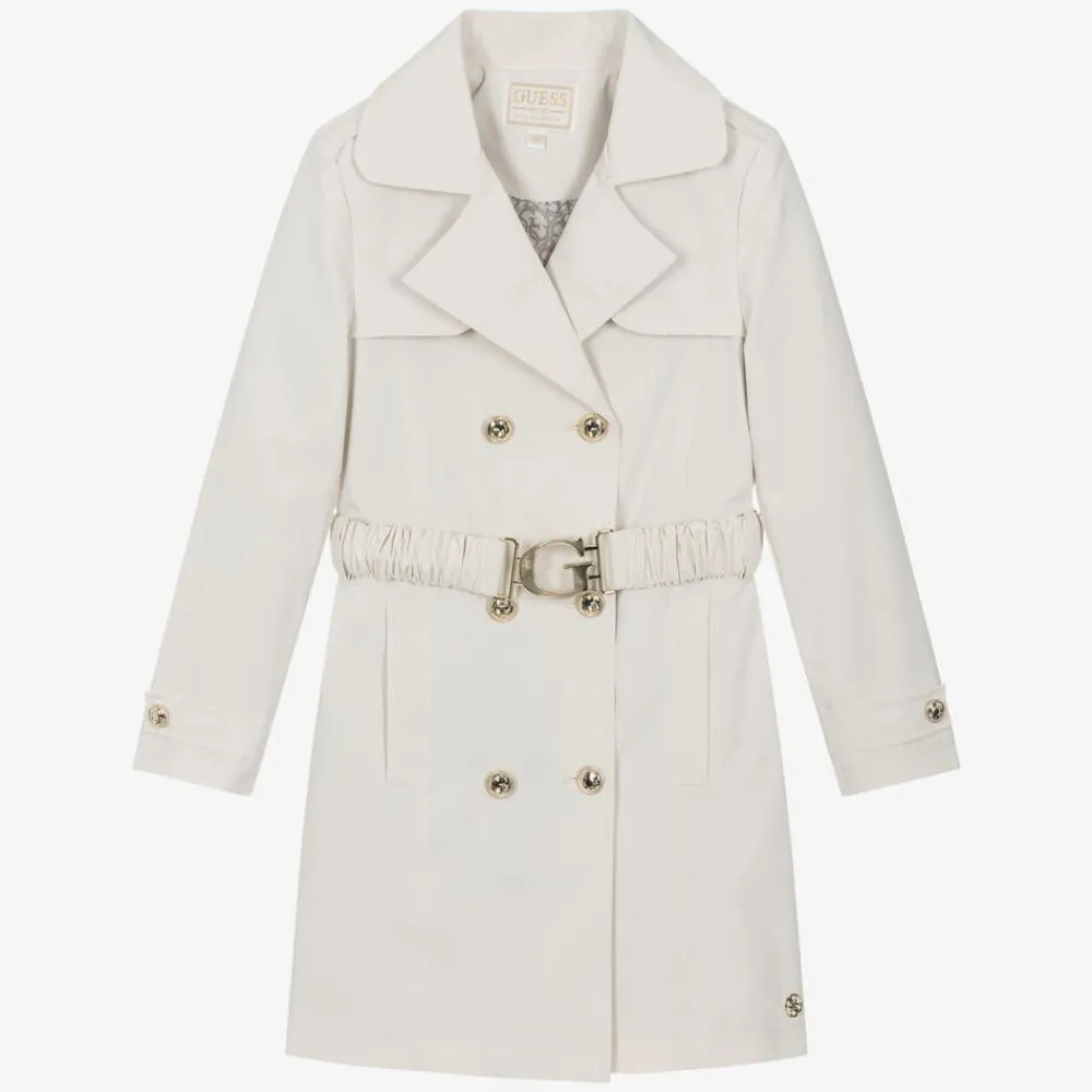 Lovely ivory trench coat for junior girls by Guess, made in silky smooth, lightweight fabric. This double-breasted style fastens with gold logo buttons on the front, with decorative buttons on the cuffs to match. It has a silky lining patterned with the brand's 4g logo and a matching 4g logo charm by the hem. This stylish coat has front pockets, a back vent and a removable elasticated belt which fastens with a large metal 'G' clip.