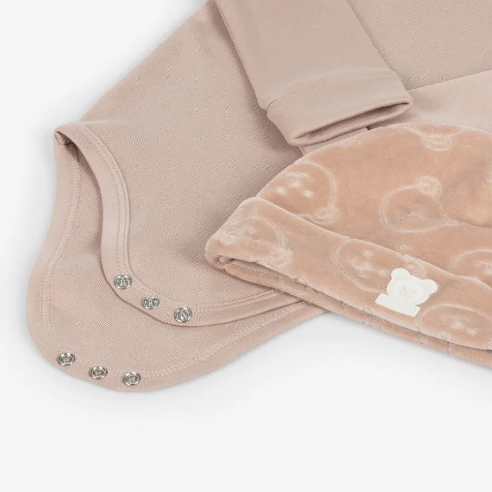 Dusky pink cotton outfit set for baby girls from Guess, comprising a bodysuit, trousers and hat, all featuring an ivory teddy logo patch. The soft jersey bodysuit has a comfortable envelope neck and poppers between the legs. It pairs with beautifully soft, velour jogger-style trousers, patterned with the designer's signature bears and logos, and trimmed with comfortable ribbing. A matching velour hat completes the set. Contains organic cotton fibre.
