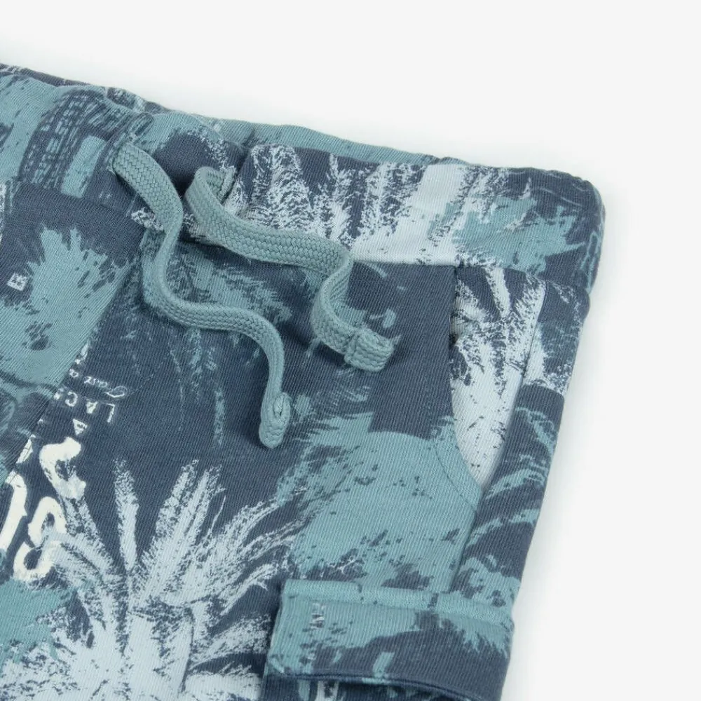 Soft, comfortable cotton shorts for younger boys by Guess, patterned with palm trees and logos in shades of blue. Bermuda length, they are made in comfortable sweatshirt jersey, with both front and cargo pockets. They have an an elasticated, drawstring waist for an ideal fit and an embroidered logo around the back for added brand identity.