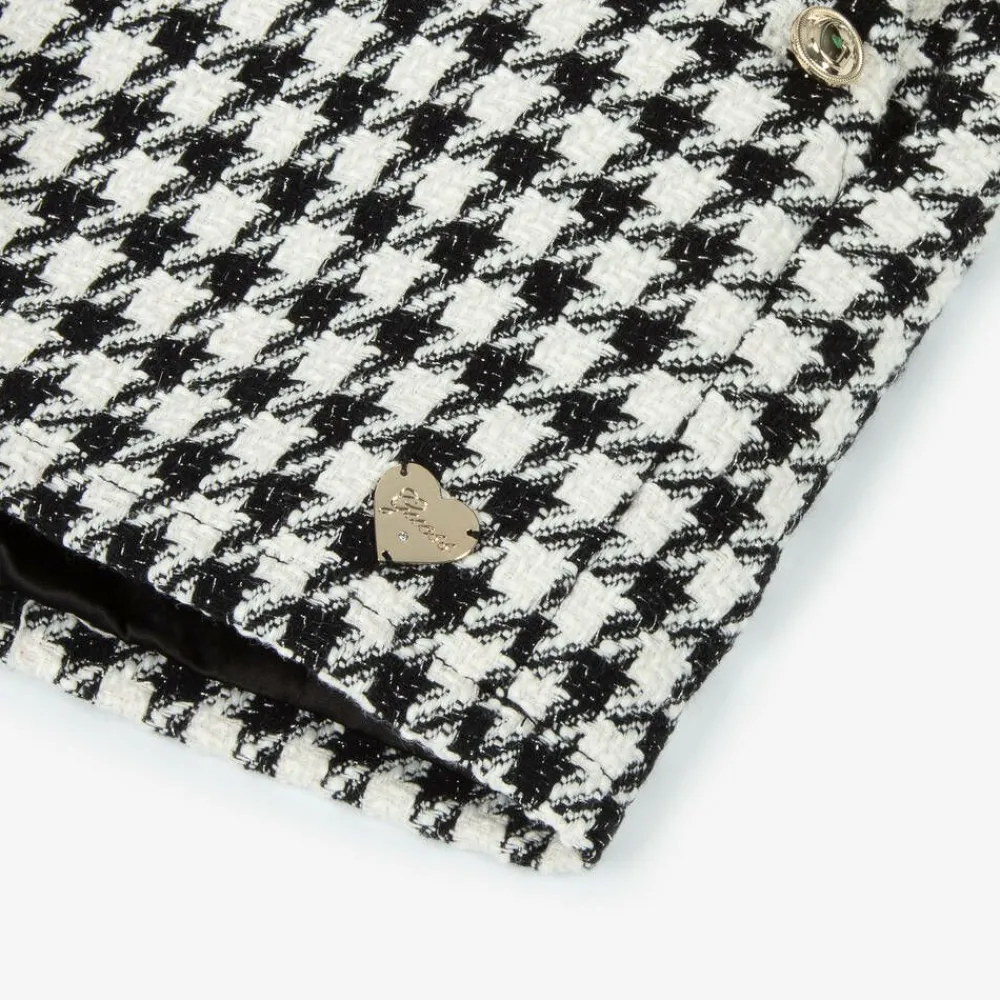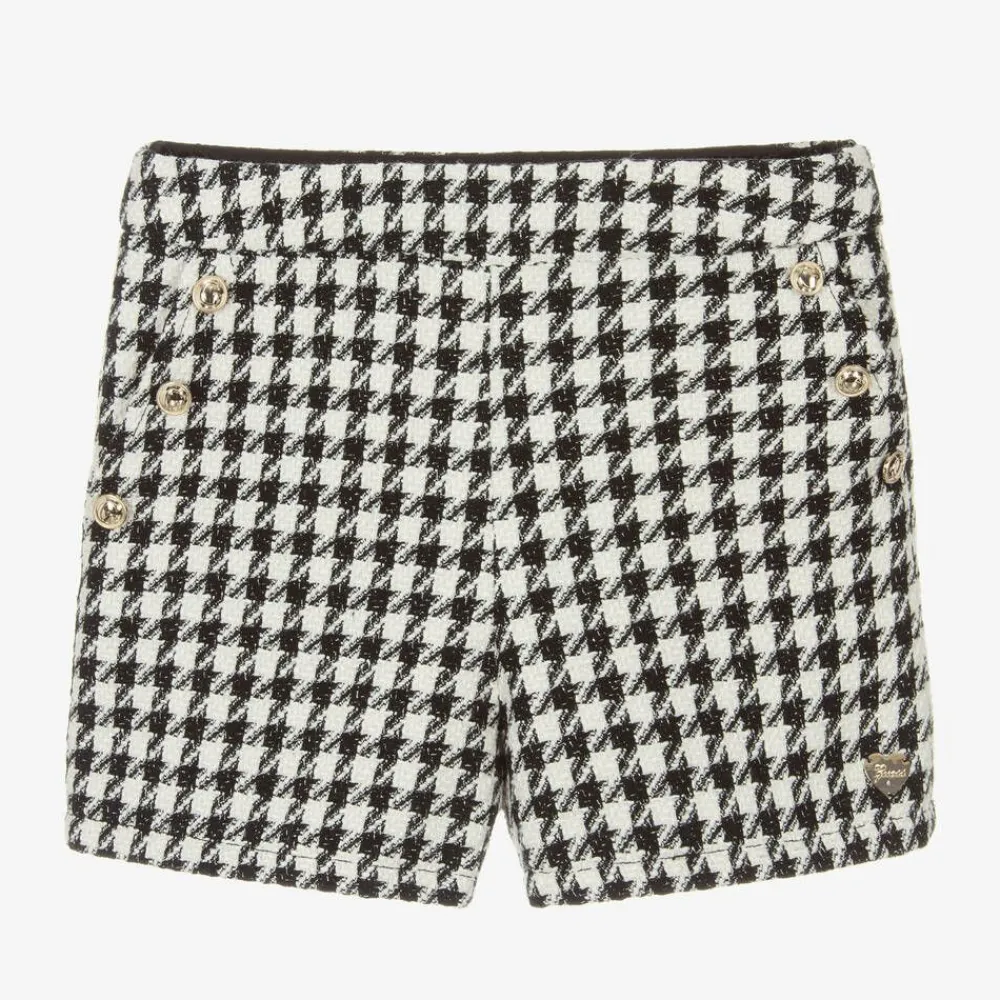 Smart black and white houndstooth shorts for junior girls by Guess. Made in mid-weight tweed they have an adjustable waistband for a good fit and fasten with a concealed zip on the side. The slanted front pockets have branded gold decorative buttons, and a heart logo badge on the hem gives a designer finish.