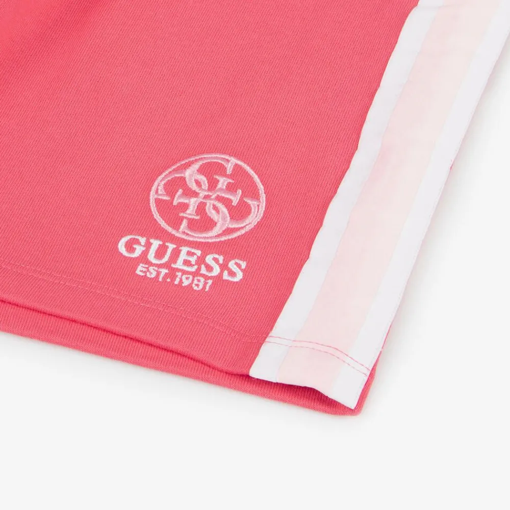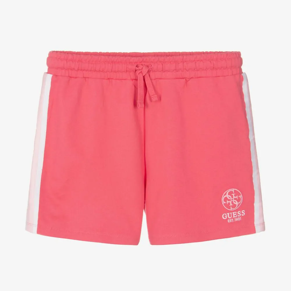 Sporty pink cotton jersey shorts for junior girls by Guess, with contrasting pale pink and white stripes on the sides. Made in mid-weight sweatshirt jersey, they have a comfortable, elasticated waistband with a drawstring for a great fit. A 4g logo is embroidered on one leg for instant brand identity.