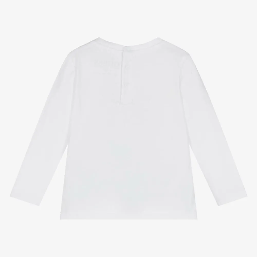 A white long-sleeved cotton top for baby boys by Guess. For a good vibe, the front has a colourful print of the iconic triangle logo in a fun cartoon-style graphic and 'be kind' slogan. The popper fastenings on the back allow easier dressing. This casual jersey top contains organic cotton fibre.