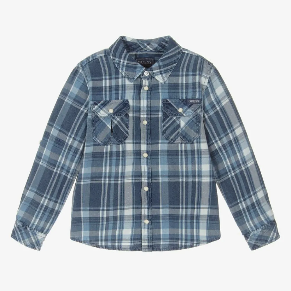 In shades of blue, a cool cotton shirt for younger boys by Guess, made in soft twill. This casual style has pearly popper fastenings on the front, chest pockets and cuffs, with a branded button fastening at the neck. There is a logo tab on the front for a subtle branded touch and the sleeves can be rolled up and secured with a button tab.