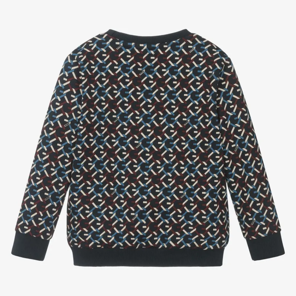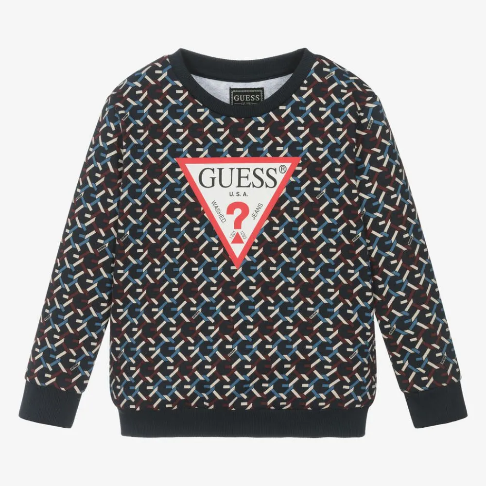 Navy blue sweatshirt for younger boys by Guess, with a logo pattern. Made in comfortable, mid-weight cotton jersey, it has a crew neck and gently ribbed trims. For instant designer appeal, the American brand's iconic Triangle logo is printed on the chest in red and white.