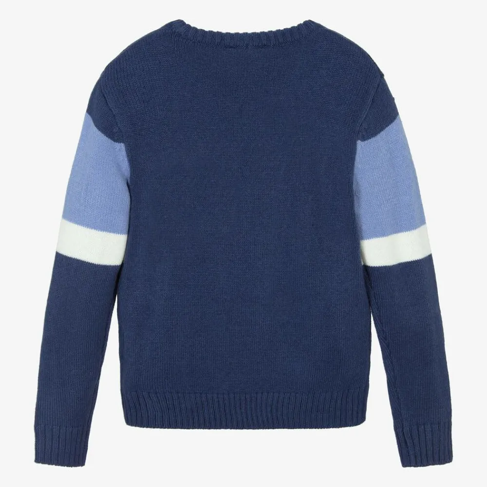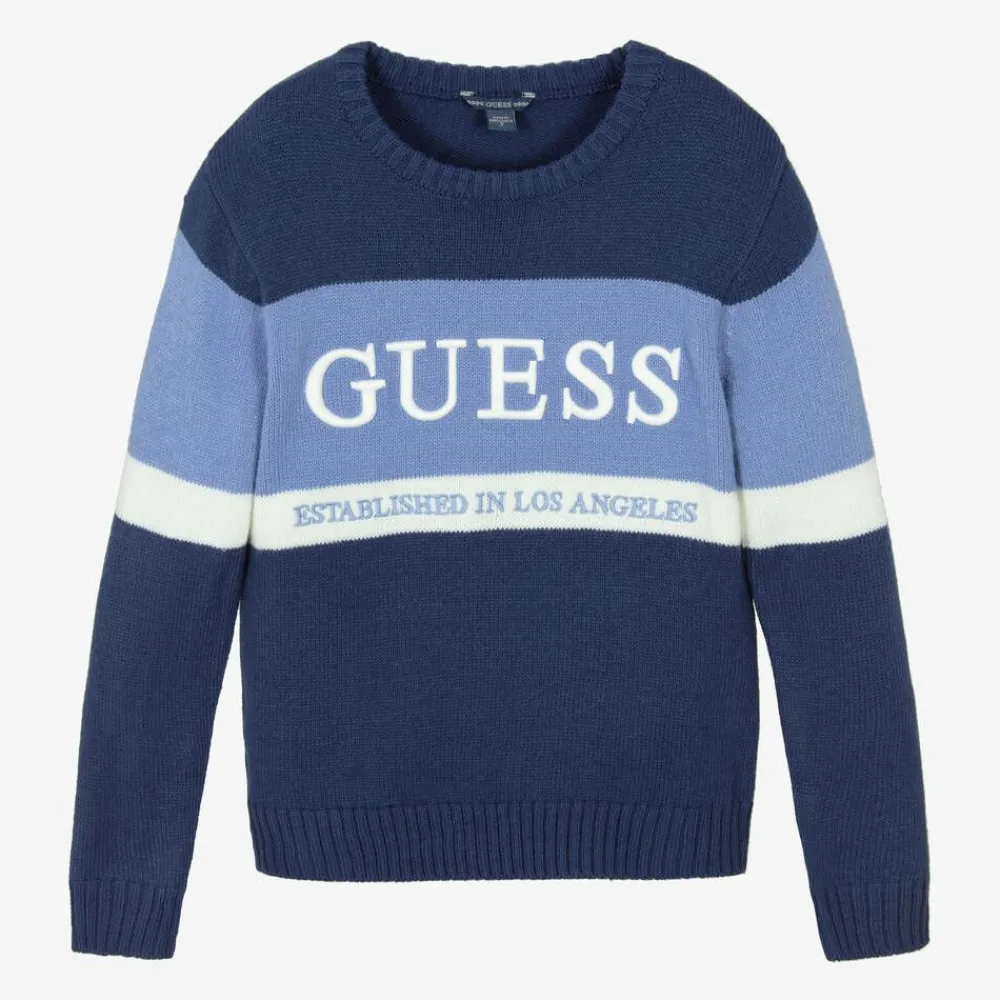 From Guess for junior boys, a blue knitted jumper. Casually styled, this tight-knit jumper has ribbed trims on the neckline, cuffs and hem to keep warmth in whether worn separately or layered. The front has light blue and white stripes across the chest onto the arms with the brand name and established location in contrasting colours.