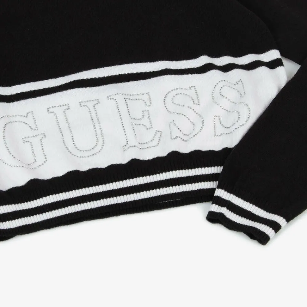 Black sweater for junior girls by Guess, knitted in a soft cotton and viscose blend. The ribbed cuffs and hem have white striped trim for a sporty look and there is a white panel around the front and back with the brand's name spelt out in sparkly diamantés.