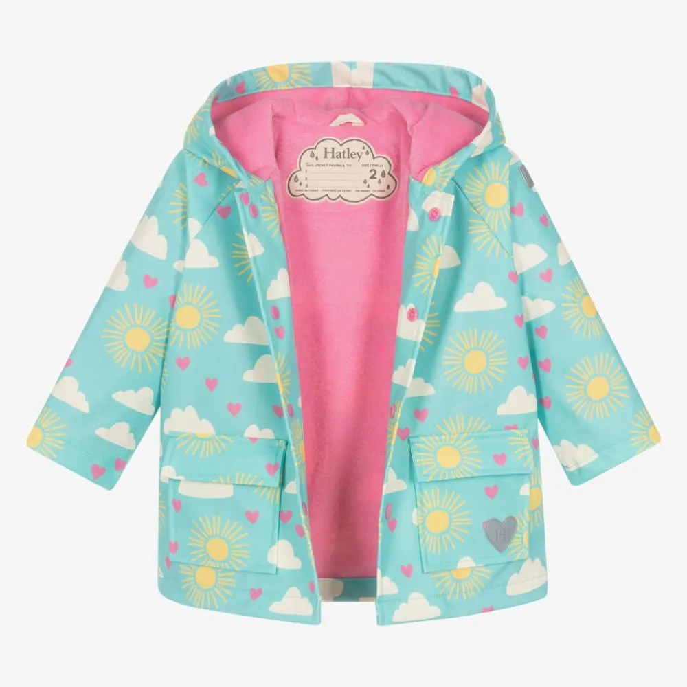 An aqua blue hooded raincoat for younger girls by Hatley, printed with a lovely sky design, featuring sunshine, pink hearts and clouds. Practical to wear on rainy days, it has a smooth waterproof coating and light reflective logo patches with a soft pink terry towelling lining for extra comfort. It fastens with pink poppers on the front.