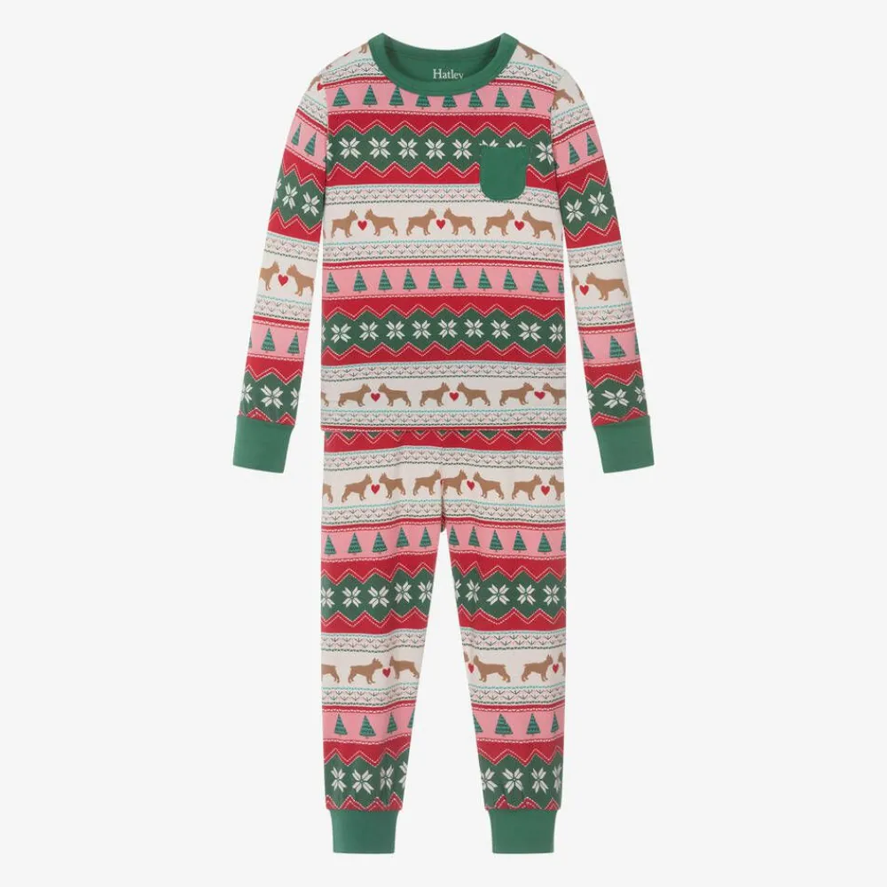 Festive long pyjamas for girls by Canadian brand Hatley, with a pink and green Fair Isle inspired print. They are made in super soft bamboo viscose jersey and are designed to fit snugly. Comfortable for sleeping or lounging, the top has a cute green chest pocket and the trousers have a gently elasticated waist.