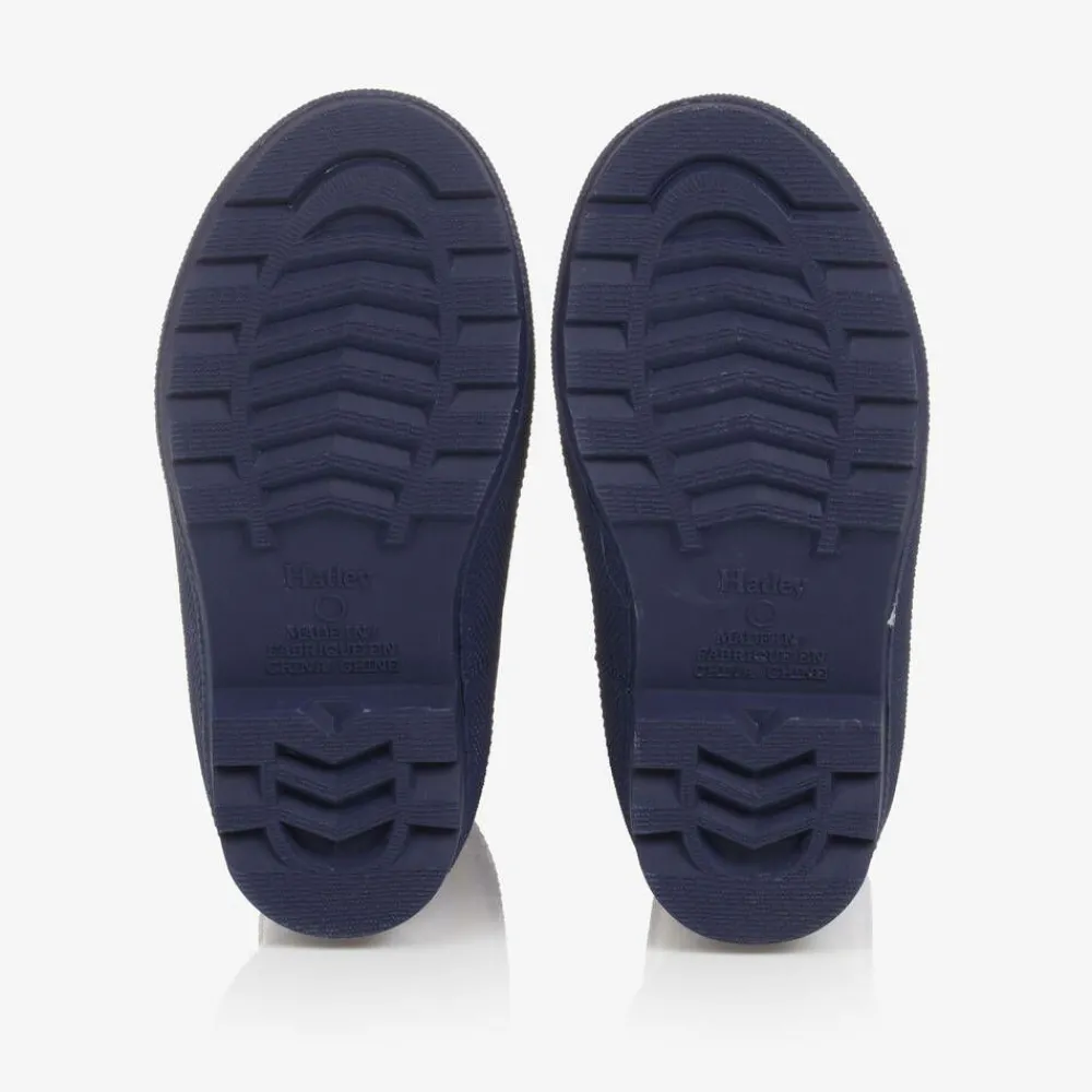 Blue slip-on rain boots for boys by Hatley, made from smooth rubber. Designed with a fun dinosaur fossils print, they are lined in soft cotton jersey and have a non-slip rubber outsole for good grip. The cotton-blended insoles are comfortably padded and there are reflective logo patches on the front for an added touch of branding.