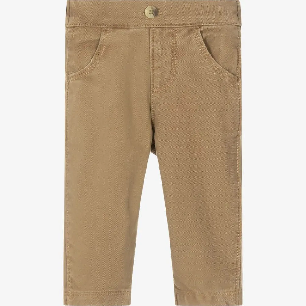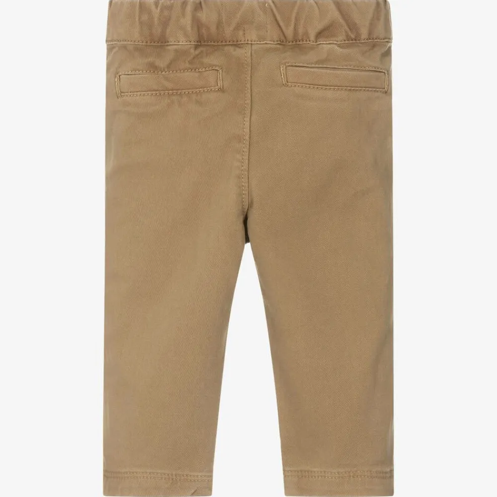 Smart-casual brown trousers for baby boys by Hatley. Made in soft cotton twill, they have a slim fit and classic style. There is a decorative tortoiseshell button and an elasticated waist for easy dressing.