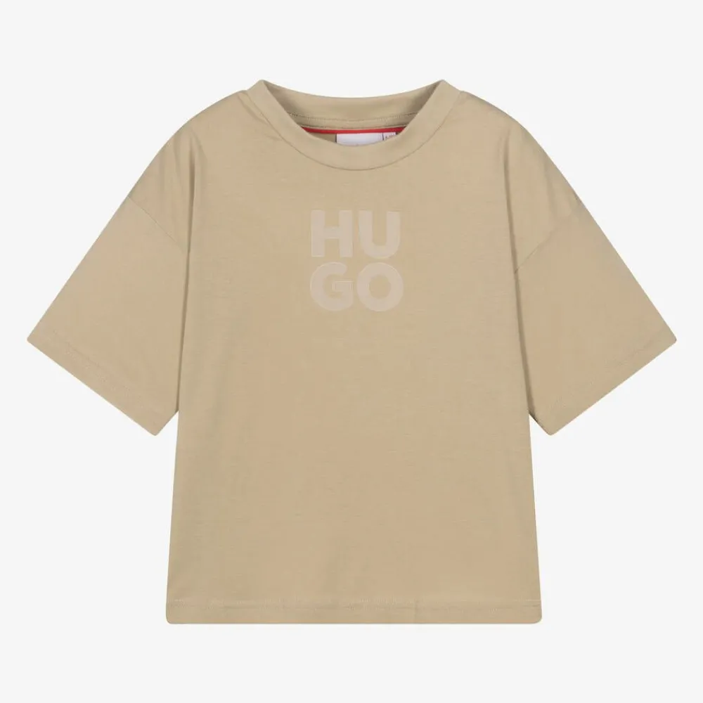 Beige T-shirt for boys by HUGO, made in soft organic cotton jersey. This simply styled piece has short sleeves, a crew neckline and a loose fit. There is a stacked logo design on the front in a tonal hue for a branded look.