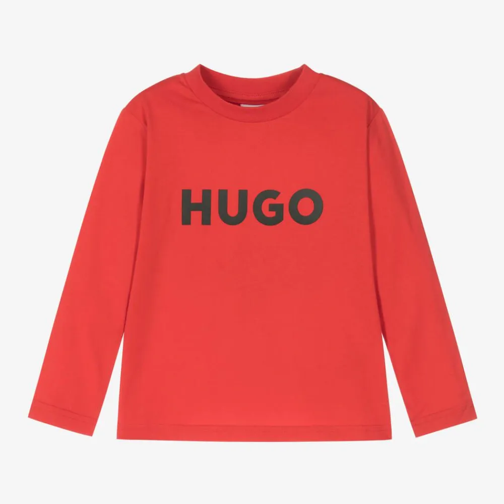 A red top for boys by HUGO, made in soft organic cotton jersey. This casual top is simply styled with a crew neck and long sleeves. The designer's name is displayed boldly on the front in black print for instant brand recognition.