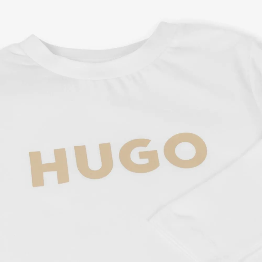A white top for boys by HUGO, made in soft organic cotton jersey. This casual top is simply styled with a crew neck and long sleeves. The designer's name is displayed boldly on the front in beige print for instant brand recognition.
