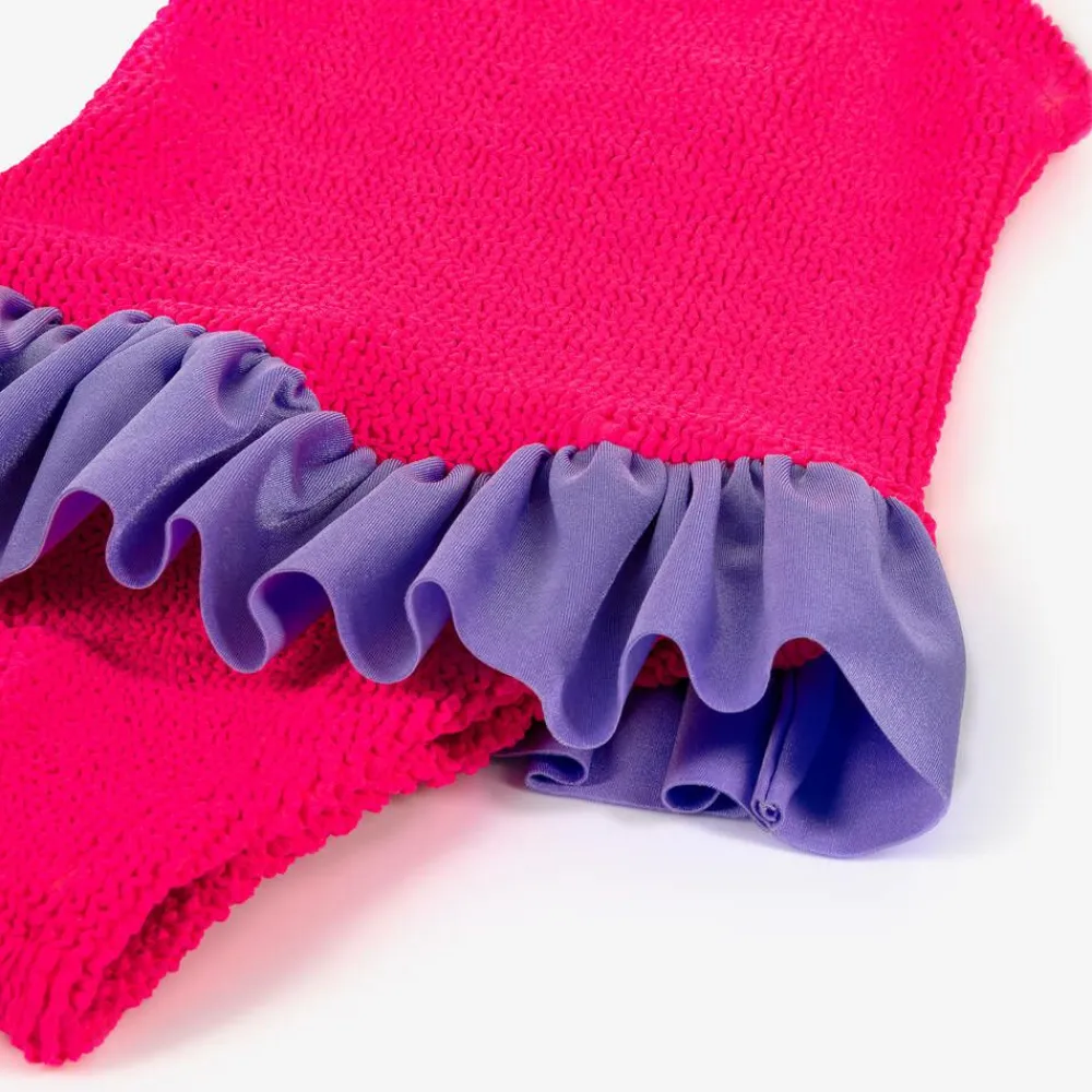 A swimsuit for girls from luxury brand Hunza G, in a fun neon pink and purple colourway. The British label has designed this stylish one-piece with a frill detail and scooped back. The bespoke, super-stretchy Original Crinkle fabric ensures the swimsuit will fit her comfortably as she grows.