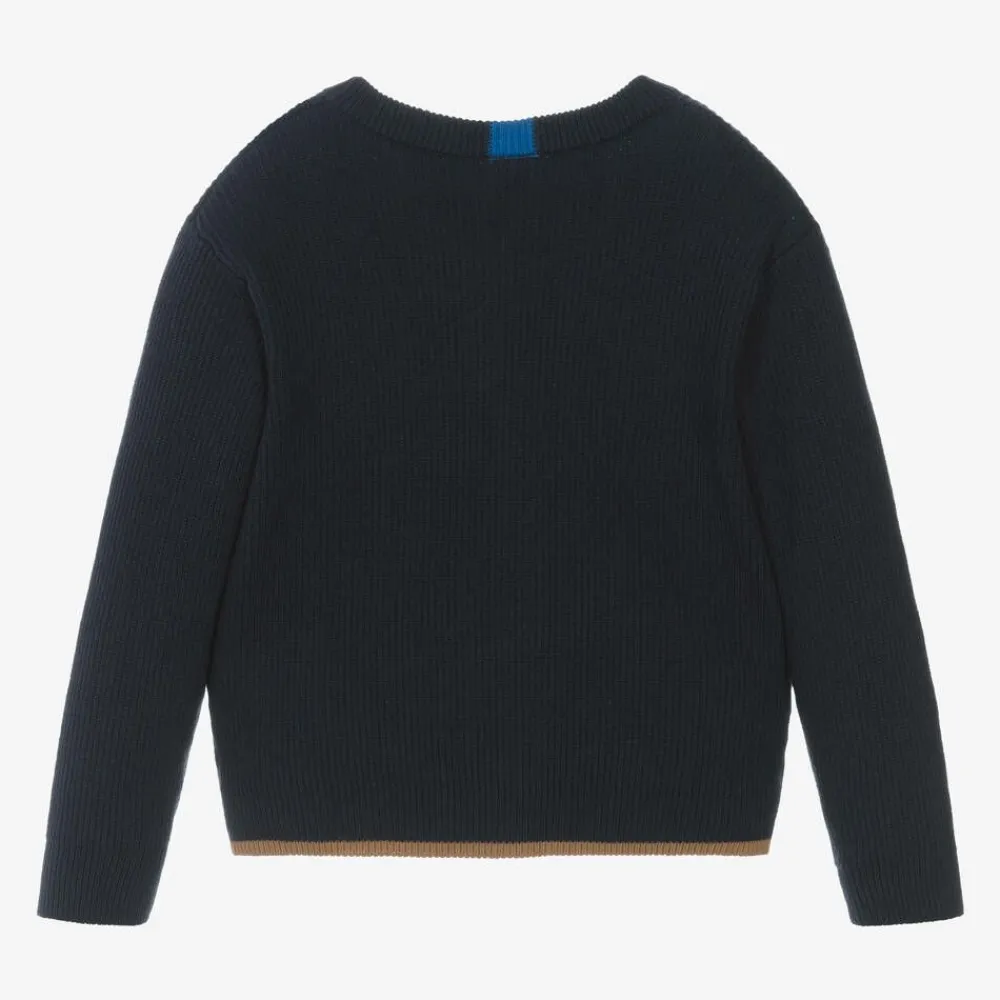 Navy blue cardigan for boys by iDO Baby, knitted in a ribbed cotton blend. Trimmed with tan brown piping, this layering piece has pockets on the front and simply fastens with buttons. A small logo badge completes the look with a subtle touch of branding.