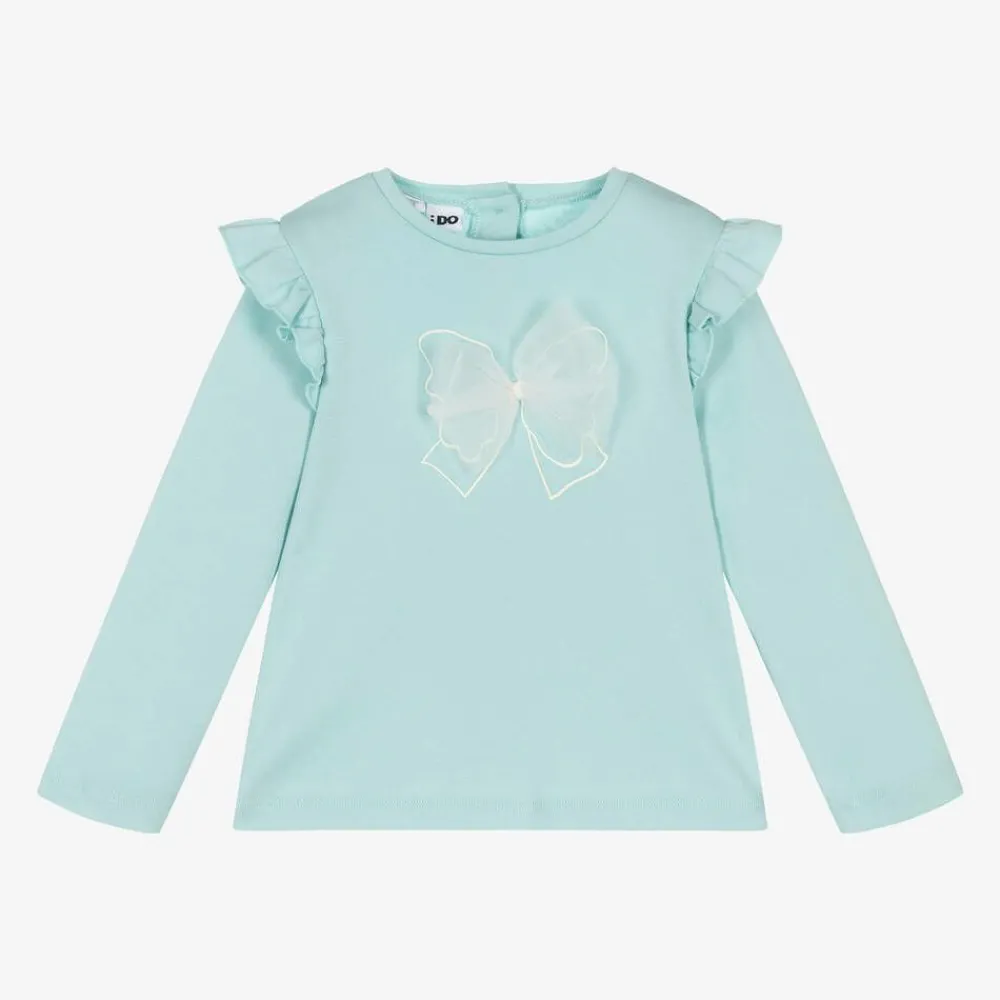 In a lovely shade of aqua blue, this long-sleeved top for girls is by iDO Baby. Made from soft cotton jersey, it has a printed ivory bow design on the chest with appliqué tulle detailing. Fastening with pearlescent branded buttons on the back, it has lovely frilled trims on the shoulders for a sweet finish.