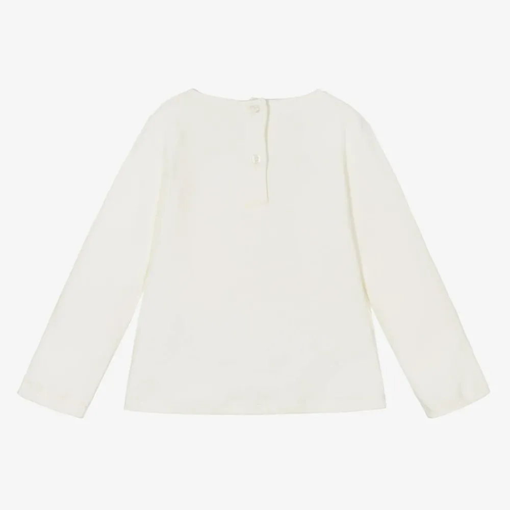 An ivory cotton top for girls by Italian designer iDO Baby. A sweet little girl holding her teddy bear is printed on the front, wearing a fluffy fleece jacket appliqué with a faux button and sparkly diamanté tights. It is made in soft jersey and fastens with buttons on the back.