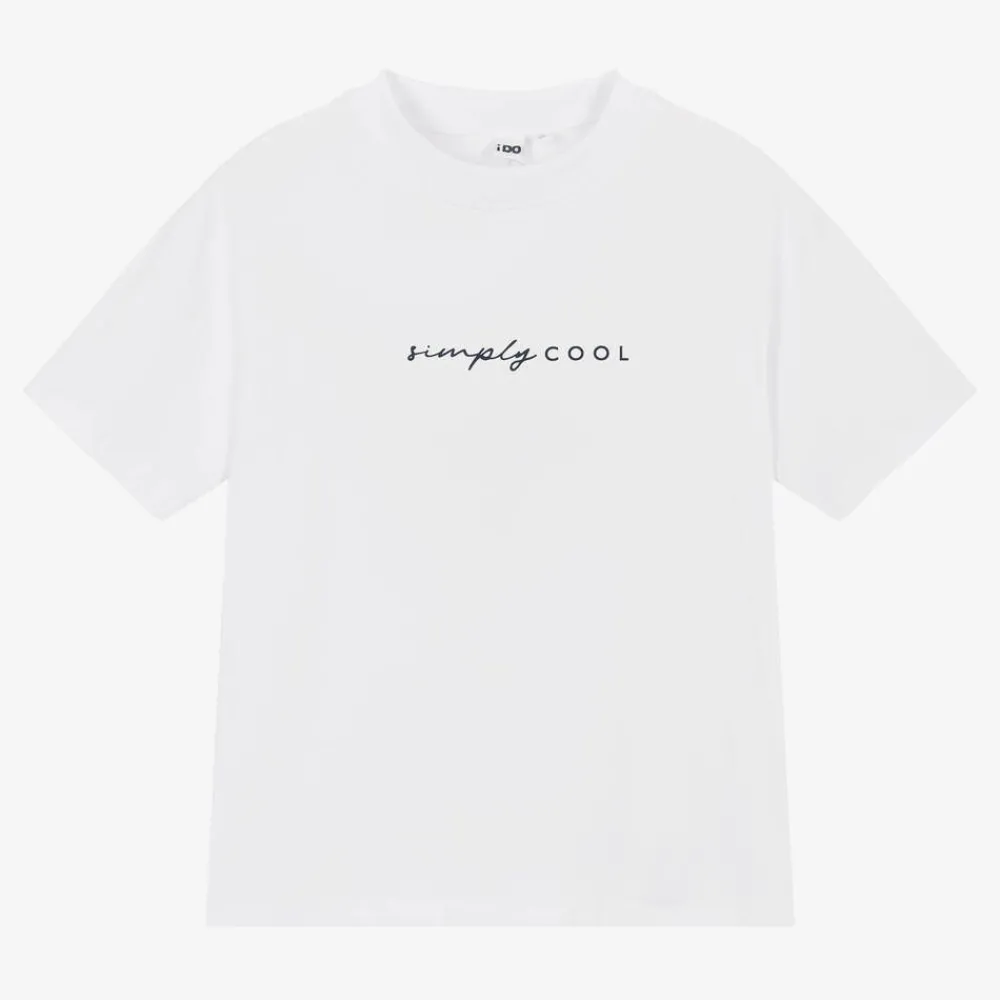 Casual white T-shirt for older boys by iDO Junior, made in soft cotton jersey. It has a 'simply cool' slogan printed across the chest and 'good times' printed on the back of the neck for a cool, graphic look.