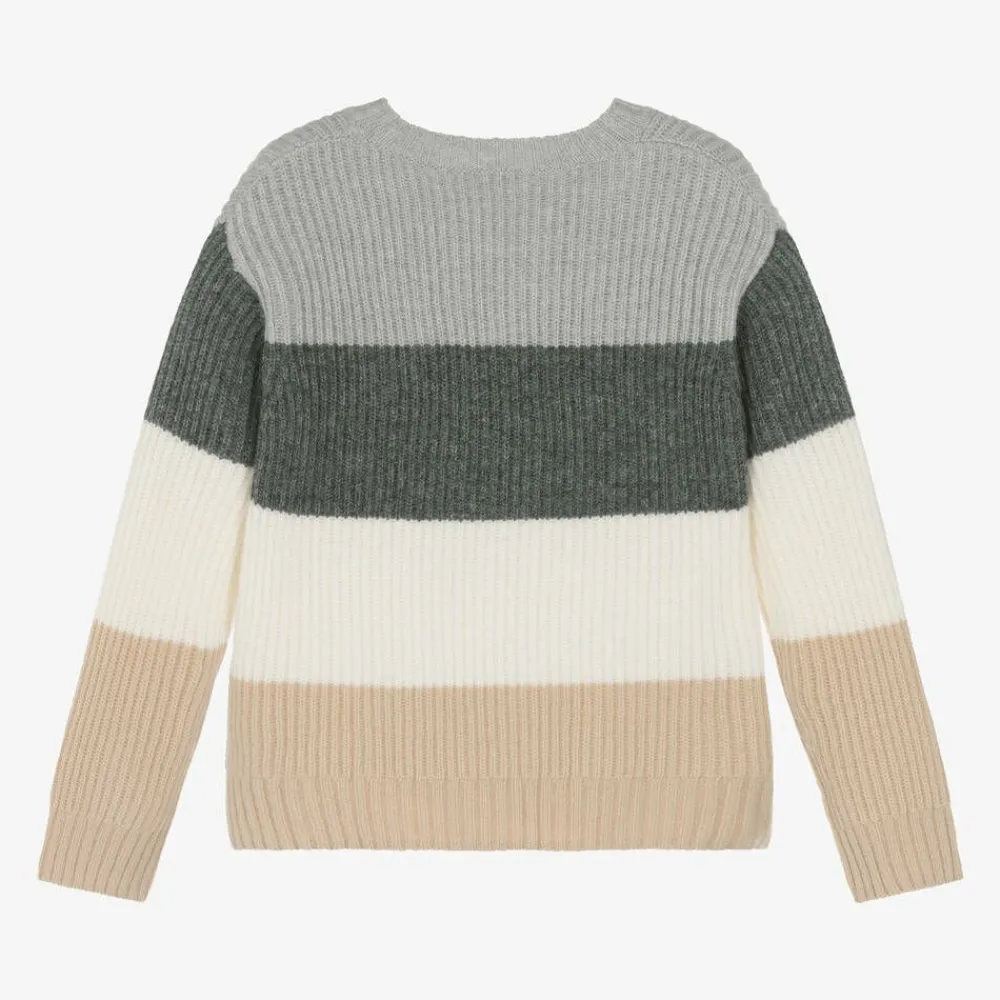 Cosy sweater for boys by Italian brand Il Gufo, in grey, ivory and beige colourblock stripes. This luxurious knitwear is beautifully crafted from Italian spun virgin wool yarn. It is subtly branded with a grey logo embroidery above the hem.