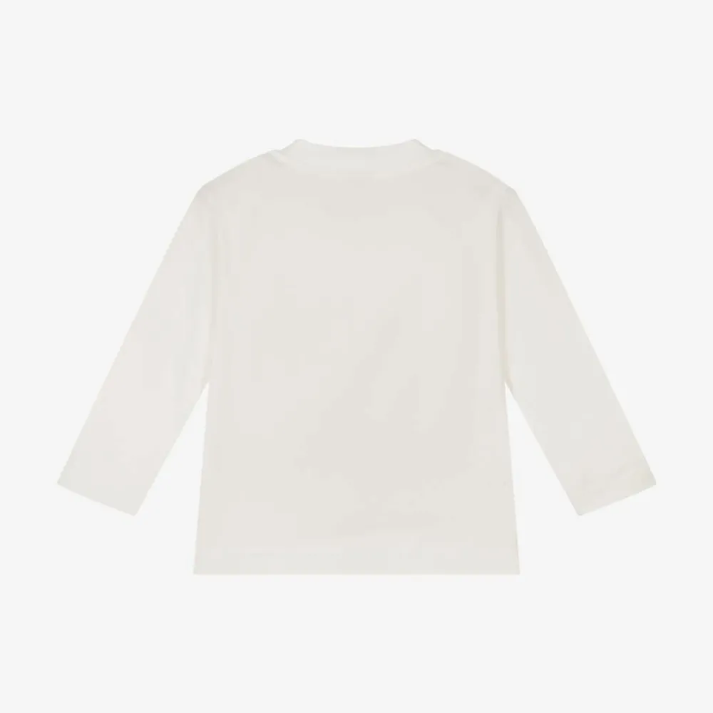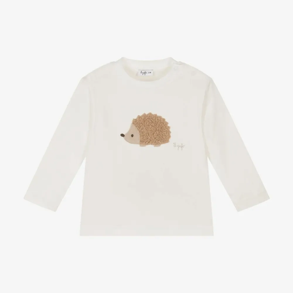 Adorable ivory long-sleeved top for little boys by luxury Italian brand Il Gufo. Made in soft cotton jersey, the front features a cute bouclé hedgehog appliqué with an embroidered logo in beige. There are popper fastenings on one shoulder to help with easier dressing.