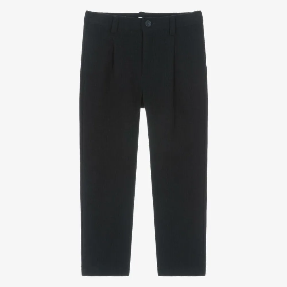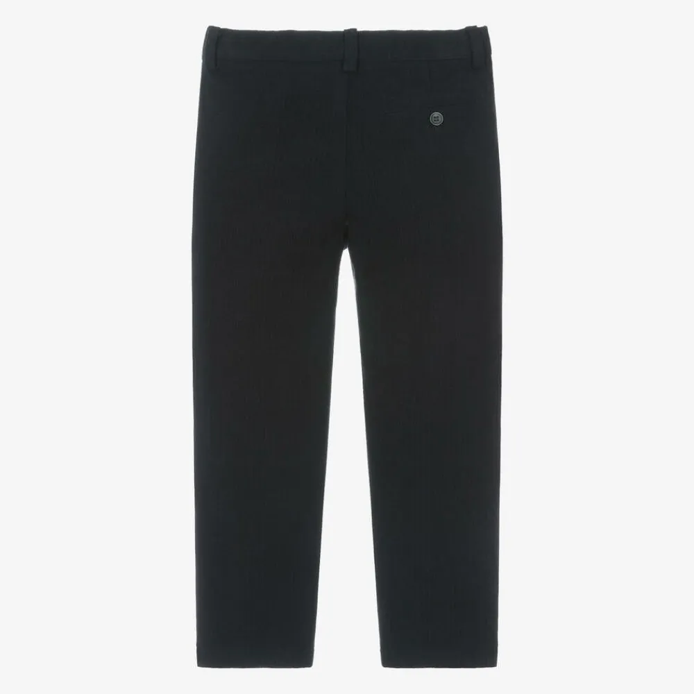 Navy blue trousers for boys by luxury Italian brand Il Gufo, made in a soft, brushed viscose blend. These smart trousers have a tonal check design, with useful side seam pockets and a pocket on the back. They fasten with a button and zip and have an adjustable waistband to ensure a comfortable fit.