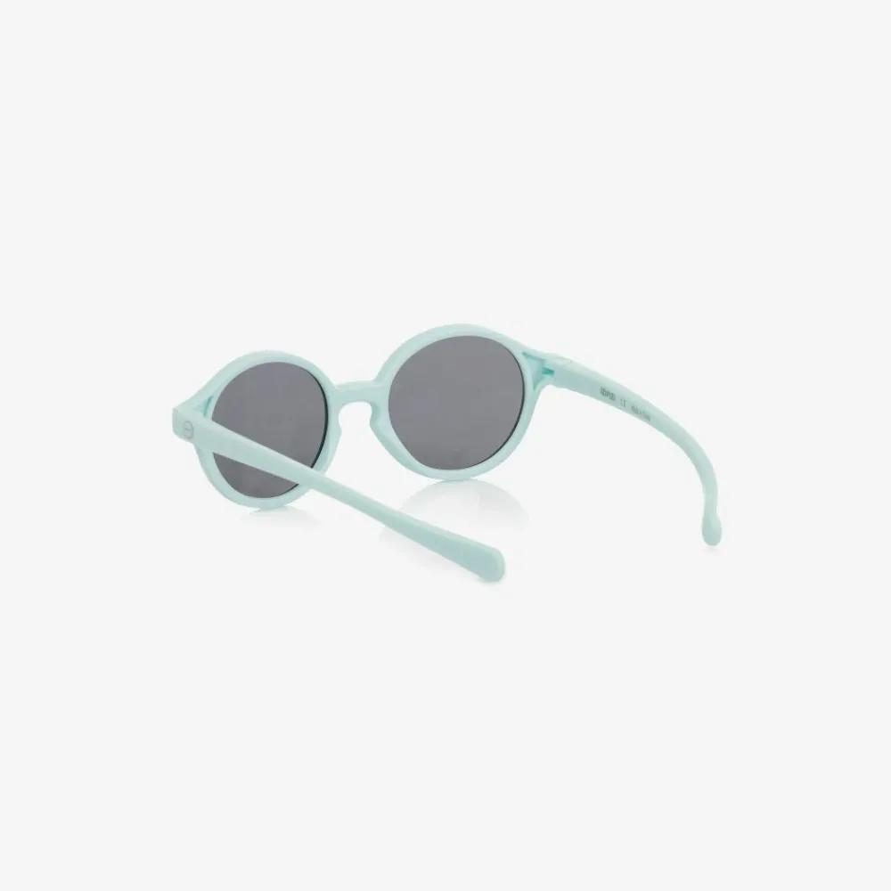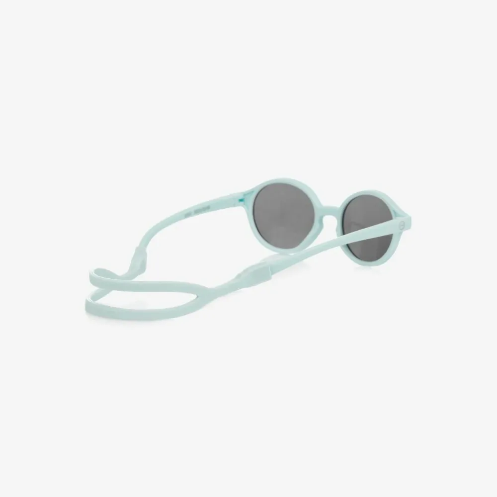 Pale blue sunglasses for baby boys and girls, by IZIPIZI. With matte blue plastic frames, they have a blue silicone strap to help keep them in place, and polarised lenses to protect your baby's eyes.