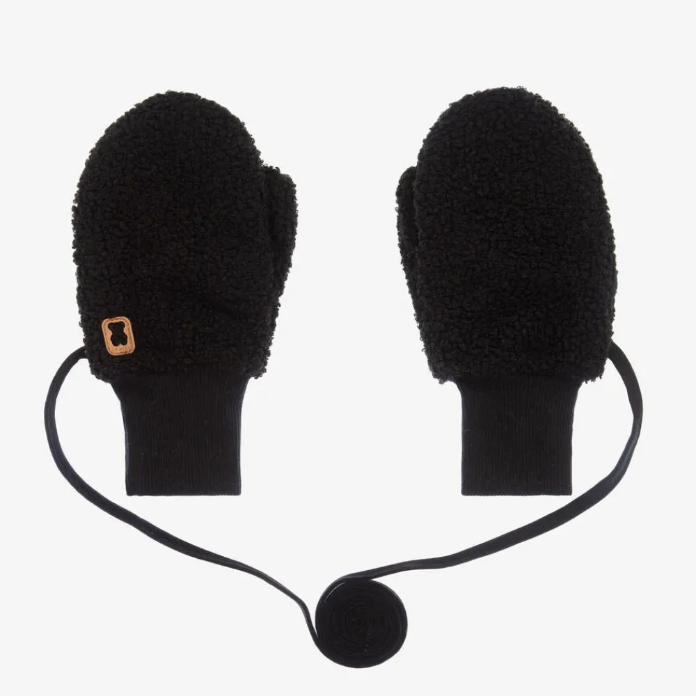 Black mittens for boys and girls from Jamiks, made in soft bouclé fleece. Lovely for those colder days, they have a cotton fleece lining for extra warmth and stretchy ribbed cuffs. The attached strap threads through the sleeves of their coat, to ensure the mittens do not get lost.