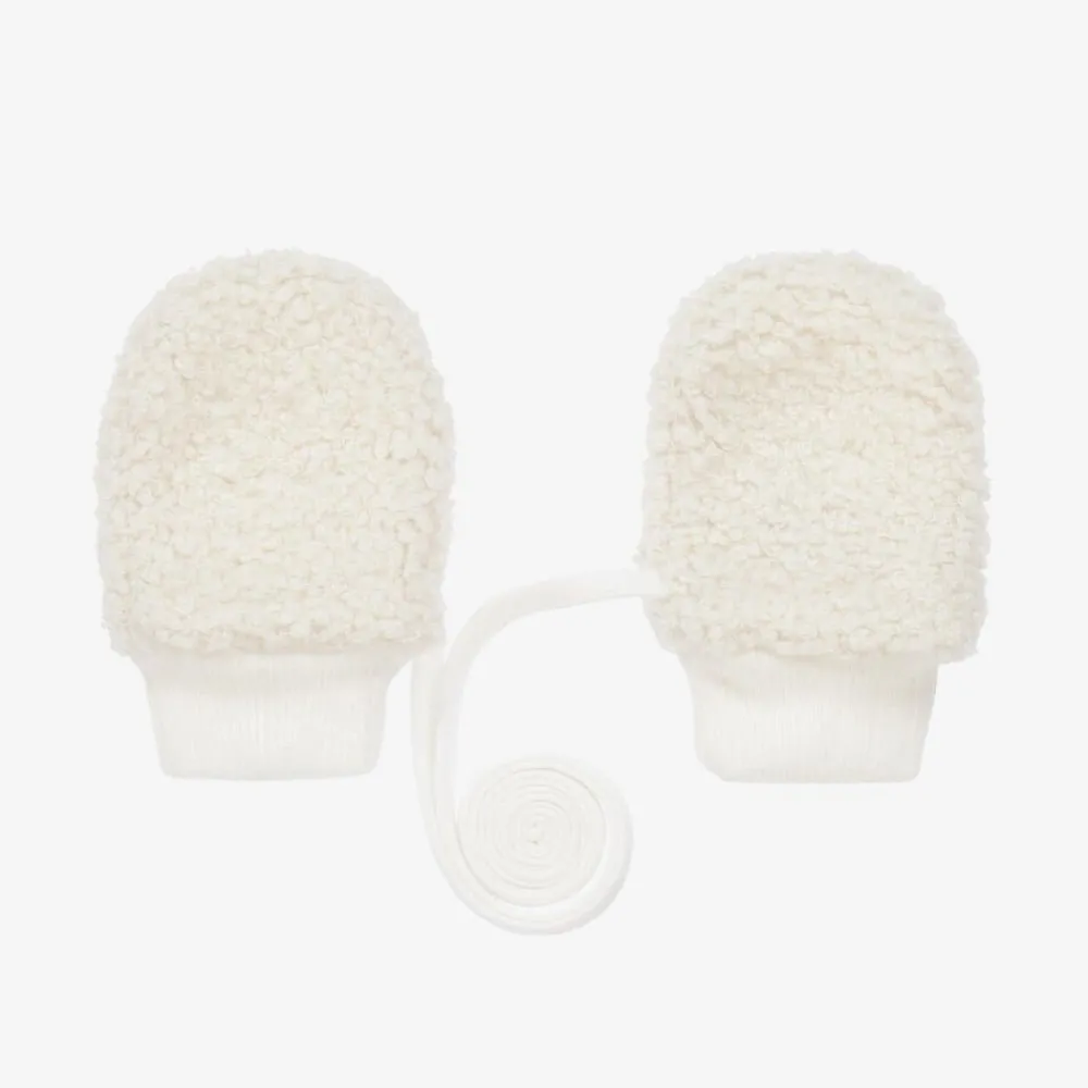 Ivory bouclé mittens for baby boys and girls from Jamiks. The beautifully soft ribbed cuffs and cotton jersey lining ensure they fit comfortably on tiny hands. The attached strap threads through the sleeves of their coat or jacket to keep the mittens safely together.