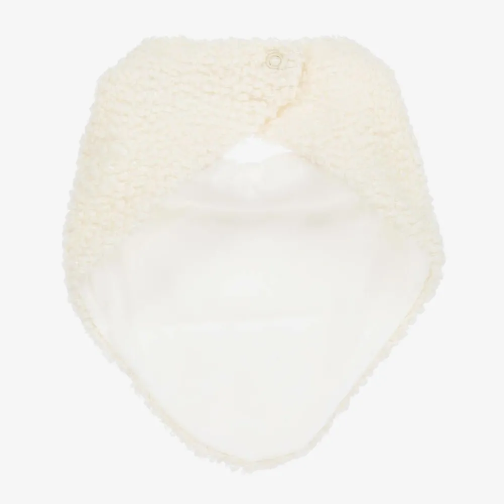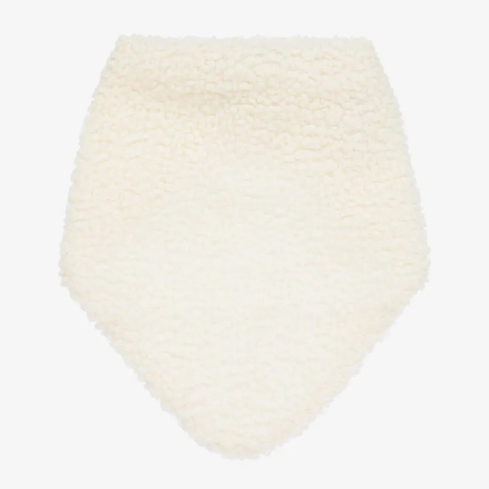 Cosy and comfortable for baby boys and girls, an ivory bouclé scarf by Polish brand Jamiks. This bandana-style neck warmer has a soft cotton jersey lining and fastens easily with a single popper behind the neck.