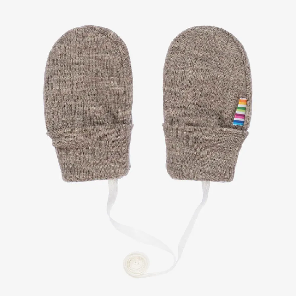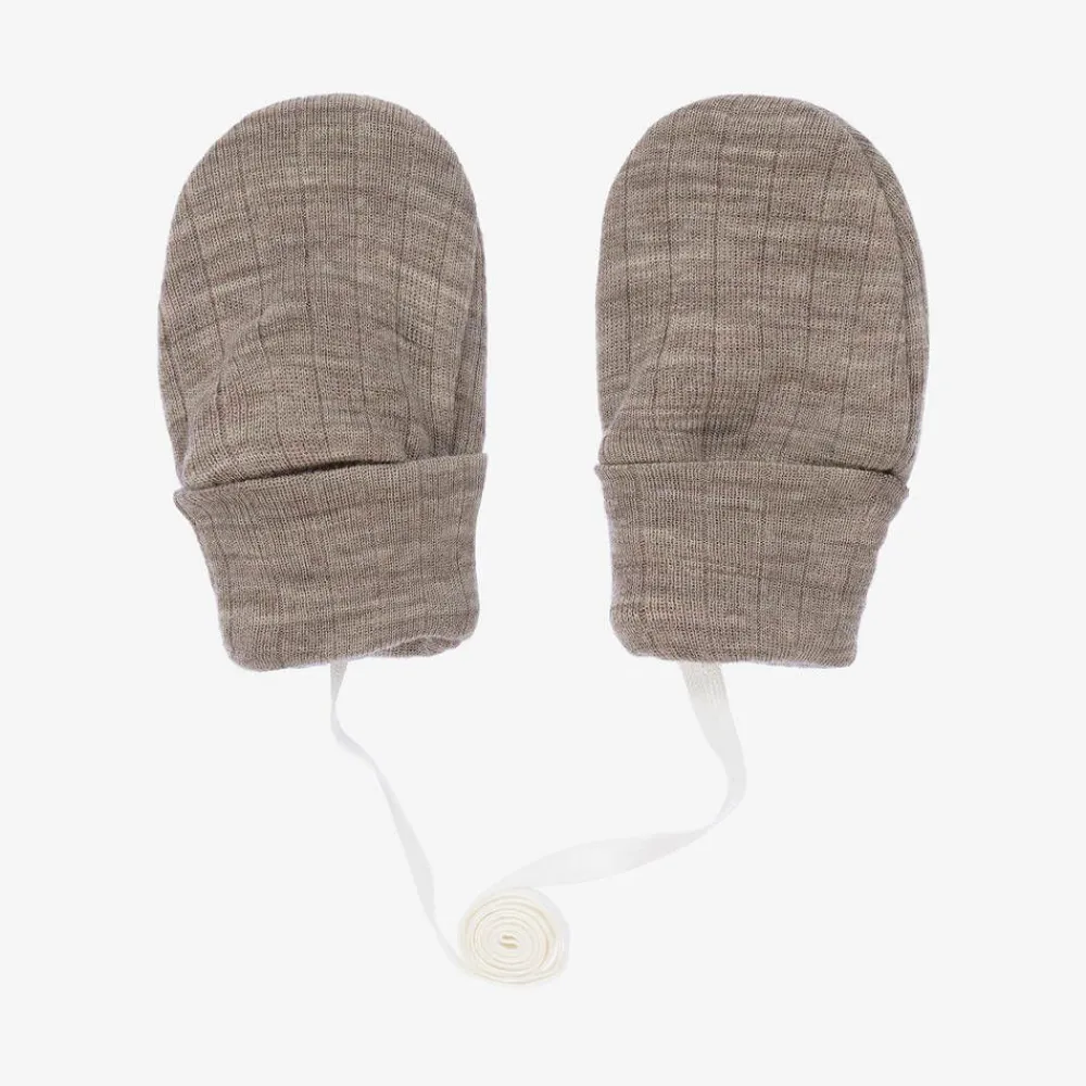 Dark beige mittens for baby boys and girls by Joha, knitted from fine Merino wool jersey. Soft, stretchy, and ribbed, they have a striped logo tab on the side seam.
