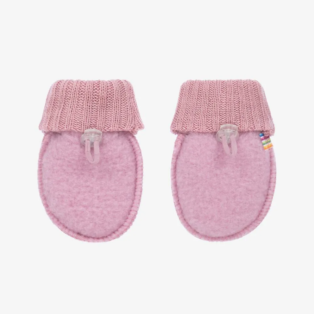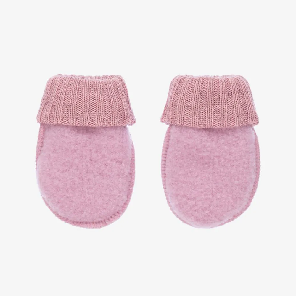 Lovely dark pink mittens for baby girls by Joha, made from super soft felted Merino wool. Warm and cosy, they have knitted trims, a striped logo tab, and a toggle fastening for a good fit.