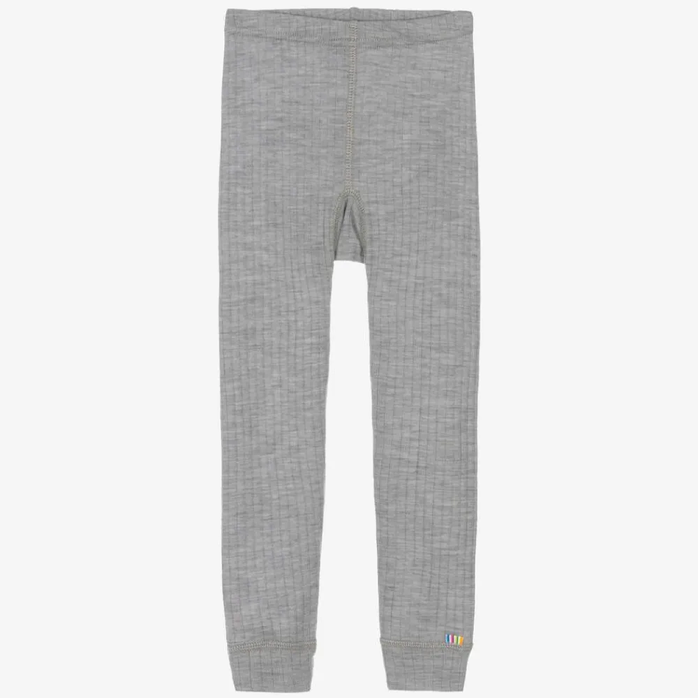 Grey thermal leggings for boys and girls by Joha, made in super soft and stretchy ribbed Merino wool. These comfortable leggings can be used for layering when the weather gets colder or can be worn alone. The waistband and cuffs are both gently elasticated and the brand's colourful striped logo tab features on one leg.