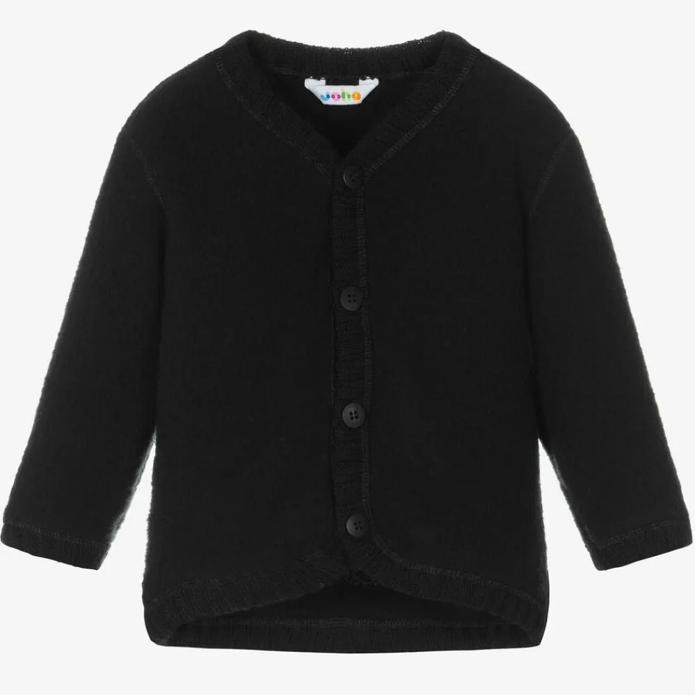 Black thermal cardigan for little boys and girls, by Danish designer Joha. Expertly made in luxuriously soft and insulating Merino wool, this unisex cardigan has a rainbow striped logo on the side seam, and ribbed trims. Lovely for layering, it is designed to help regulate the body's temperature and keep your little one warm.