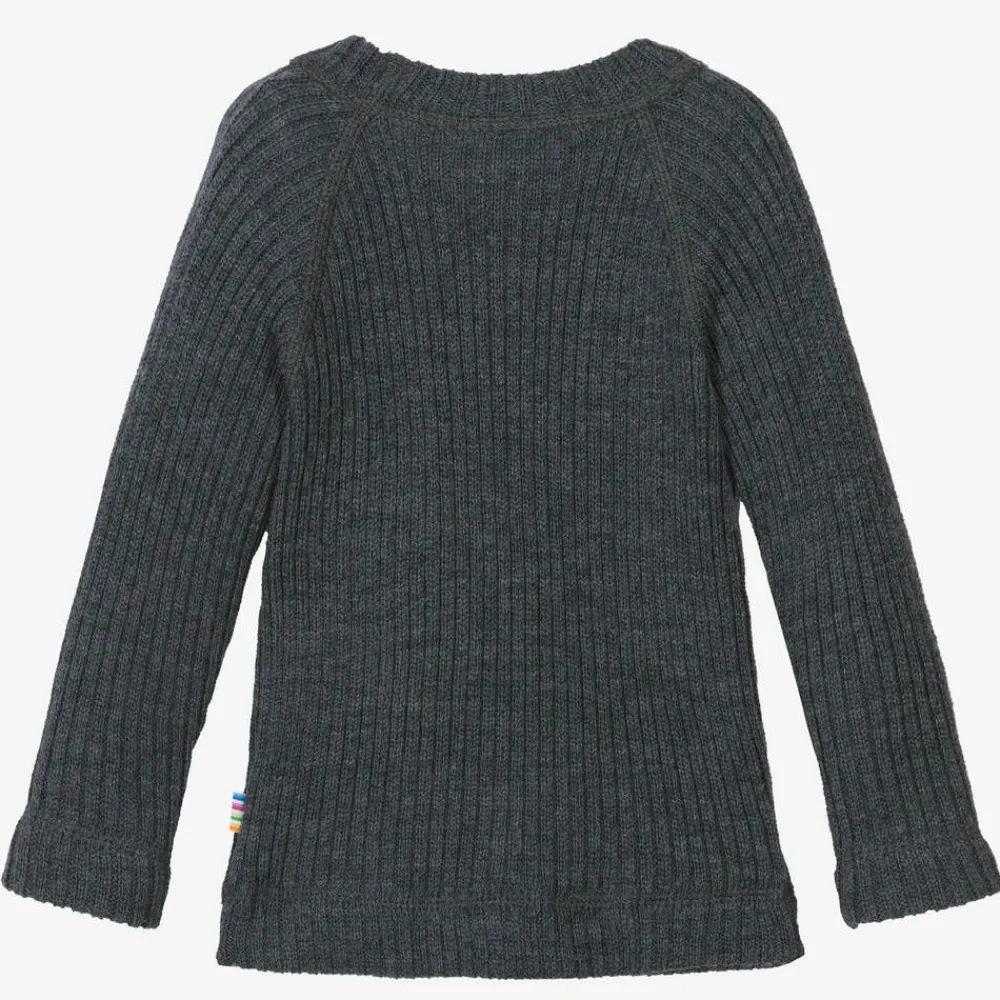 A dark grey ribbed thermal sweater for little boys and girls by Joha, made in a beautifully soft and stretchy Merino wool knit. Great for layering, it can be used as a base layer or as a cosy sweater. Designed to naturally regulate body temperature, this comfortable top has a rounded neckline and stretchy ribbed trims.