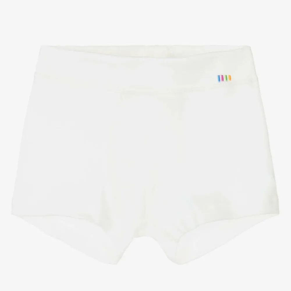 Ivory boxer shorts for boys, by Joha. Made in a luxuriously soft wool and organic cotton blend, these jersey boxers have a comfortable stretchy waist, and a cute rainbow striped logo tab. The outside has a brushed effect and the inside is ribbed, ensuring a warm and comfortable fit.