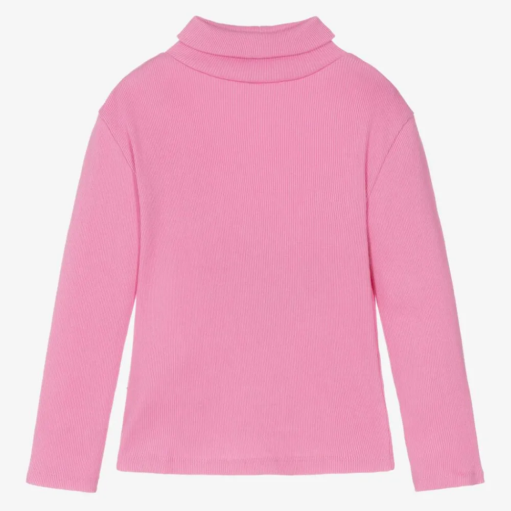 Pink cotton roll neck top for girls by British brand Joyday, exclusive to Childrensalon. Made in comfortable, ribbed jersey with a skinny fit and long sleeves, it is great for cooler weather and ideal as a layering piece.