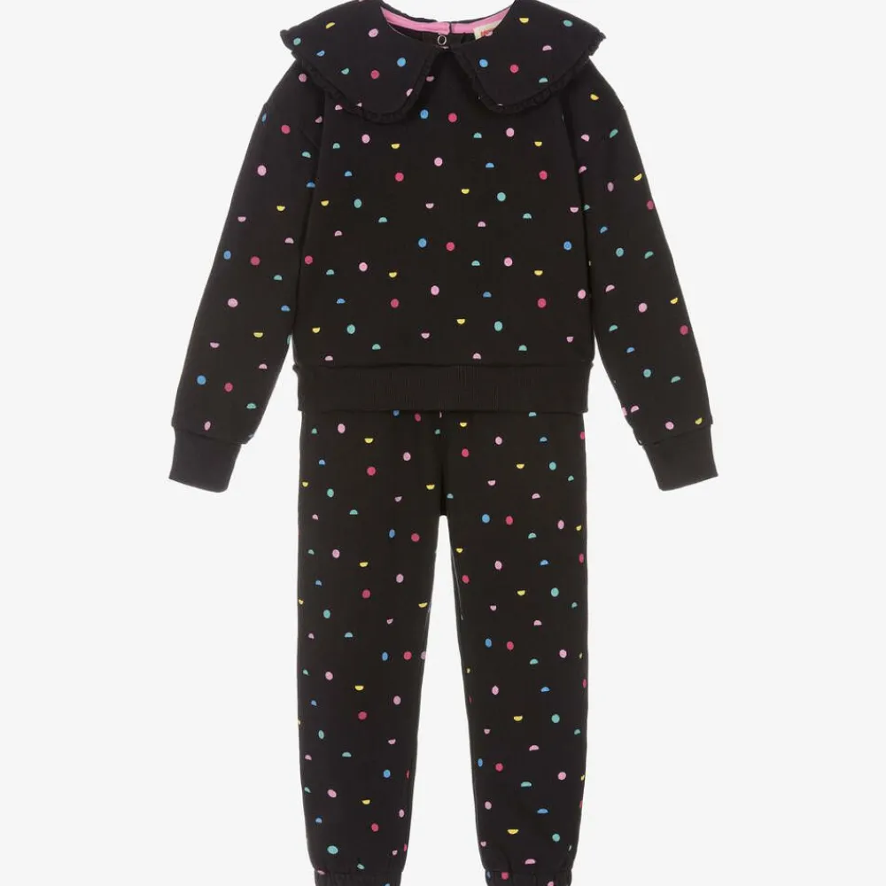 Exclusive to Childrensalon, a black tracksuit for girls by British brand Joyday, with a colourful polka dot pattern. Made in soft cotton jersey with a cosy, fleecy inside and ribbed trims, it is both warm and comfortable. Adding a stylish touch, the sweatshirt has a large collar with ruffled edging and popper fastenings on the back. The matching joggers have an adjustable drawstring waist for a good fit and useful front pockets.
