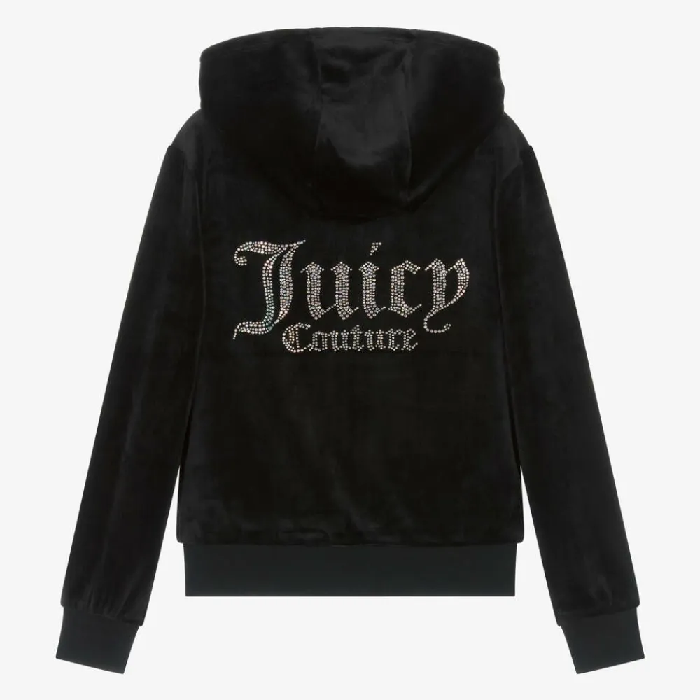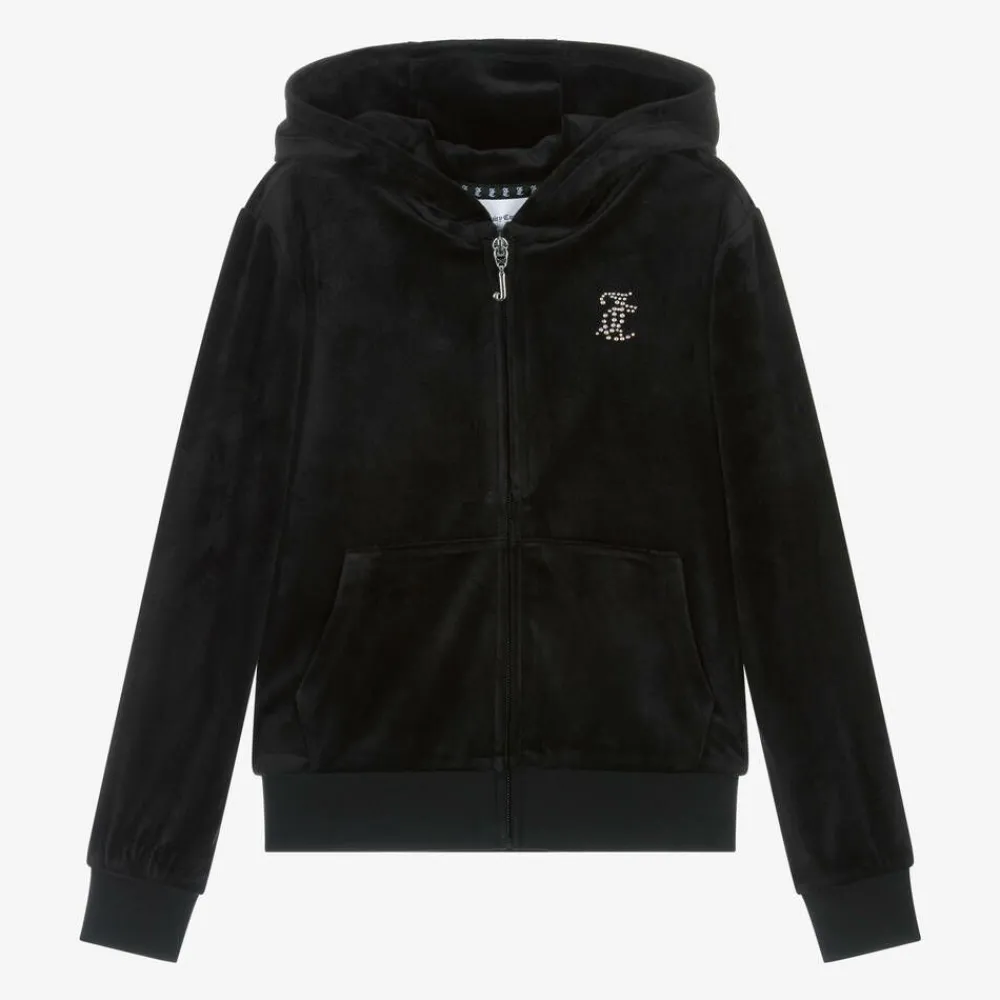 Black zip-up top for girls by Juicy Couture, made in super soft velour with a lovely sheen. There is a fixed hood and pouch pockets for extra cosiness, with iridescent diamanté logos adding a glamorous touch.