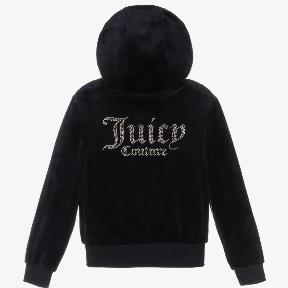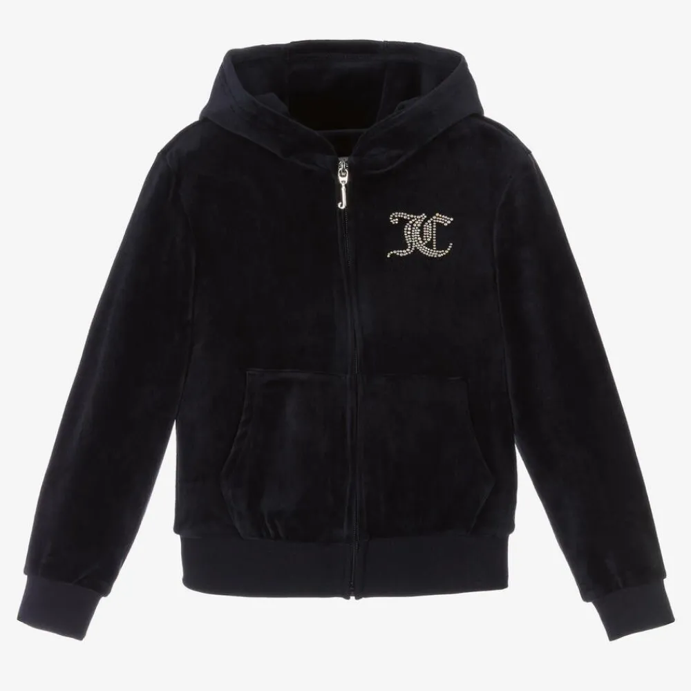 Navy blue zip-up hooded top for girls by Juicy Couture, made in super soft velour with front pouch pockets. Iridescent diamanté logos on the front and back add a sparkly finish and it fastens with a branded silver metal zip pull.