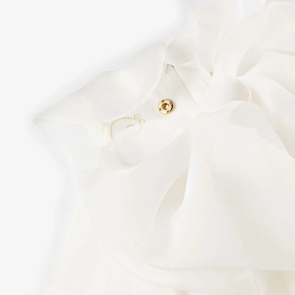 Stunning white dress for little girls by Junona, made in soft, lightweight chiffon embroidered with beautiful glittery gold flowers. Ideal for a special occasion or party, it has underlayers of soft organza and lightweight tulle for added volume and a cotton lining for comfort. This sleeveless dress has a removable, oversized silk organza bow on the back and a matching large collar, with a clear and gold crystal decoration on the front for a touch of sparkle. It fastens neatly on the back with a concealed zip.