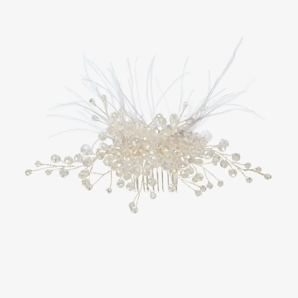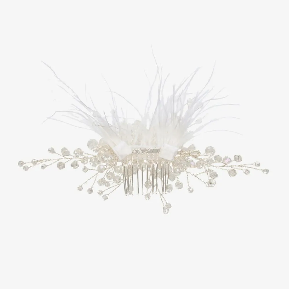 Add a touch of sophistication to her special occasion outfit with this beautiful ivory hair clip for girls by Junona. The metal comb is embellished with sparkly crystal beads and delicate white feathers for an elegant design.
