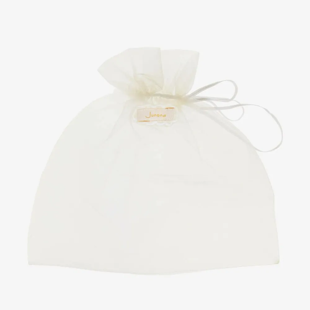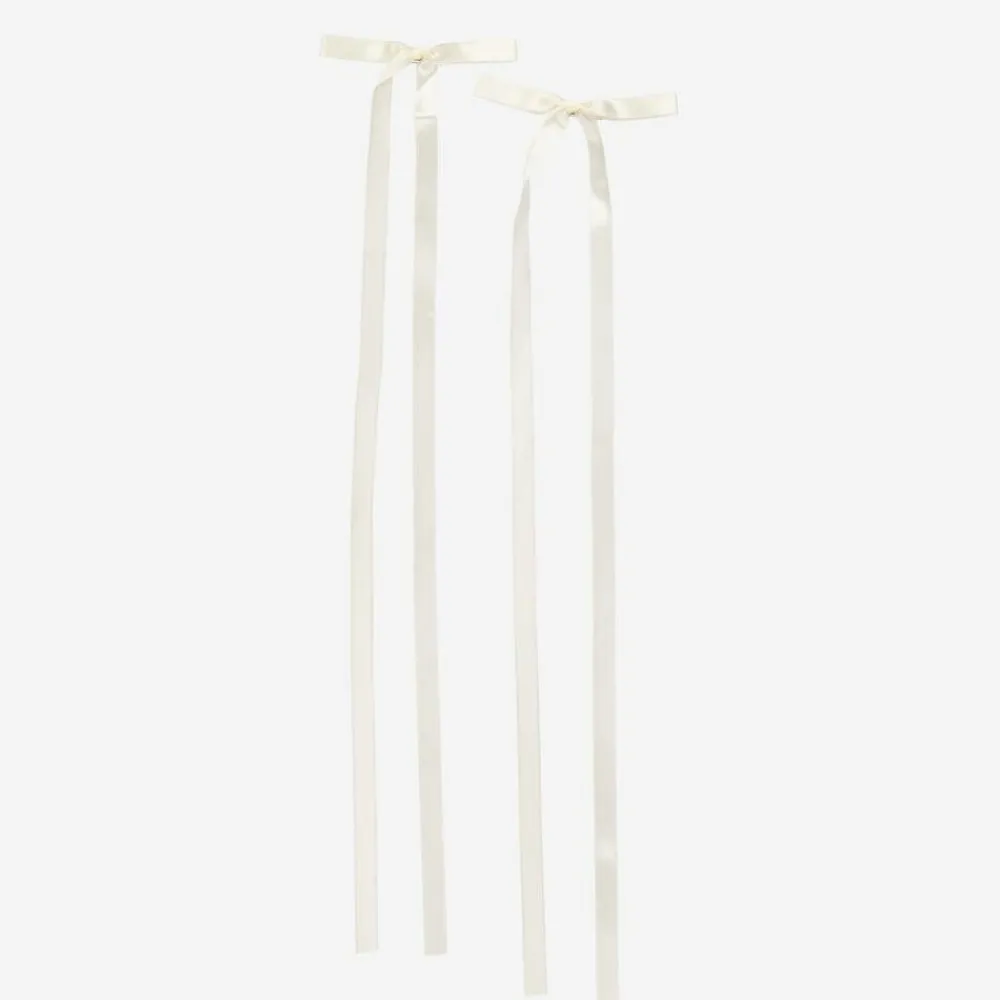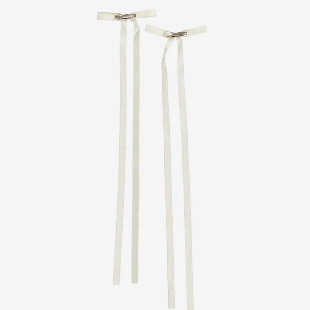 A beautiful finishing touch to her special occasion outfit, a pair of off-white satin bow hair clips for girls by Junona. These pretty hair accessories are finished with longer ties for an elegant look and are set on metal clips that slide easily into the hair.